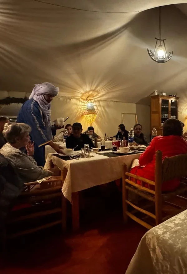 Savor authentic Moroccan cuisine in our desert camp restaurant. From slow-cooked tagines to freshly baked bread and local desserts, each meal showcases the rich flavors of the Sahara, blending tradition with comfort.