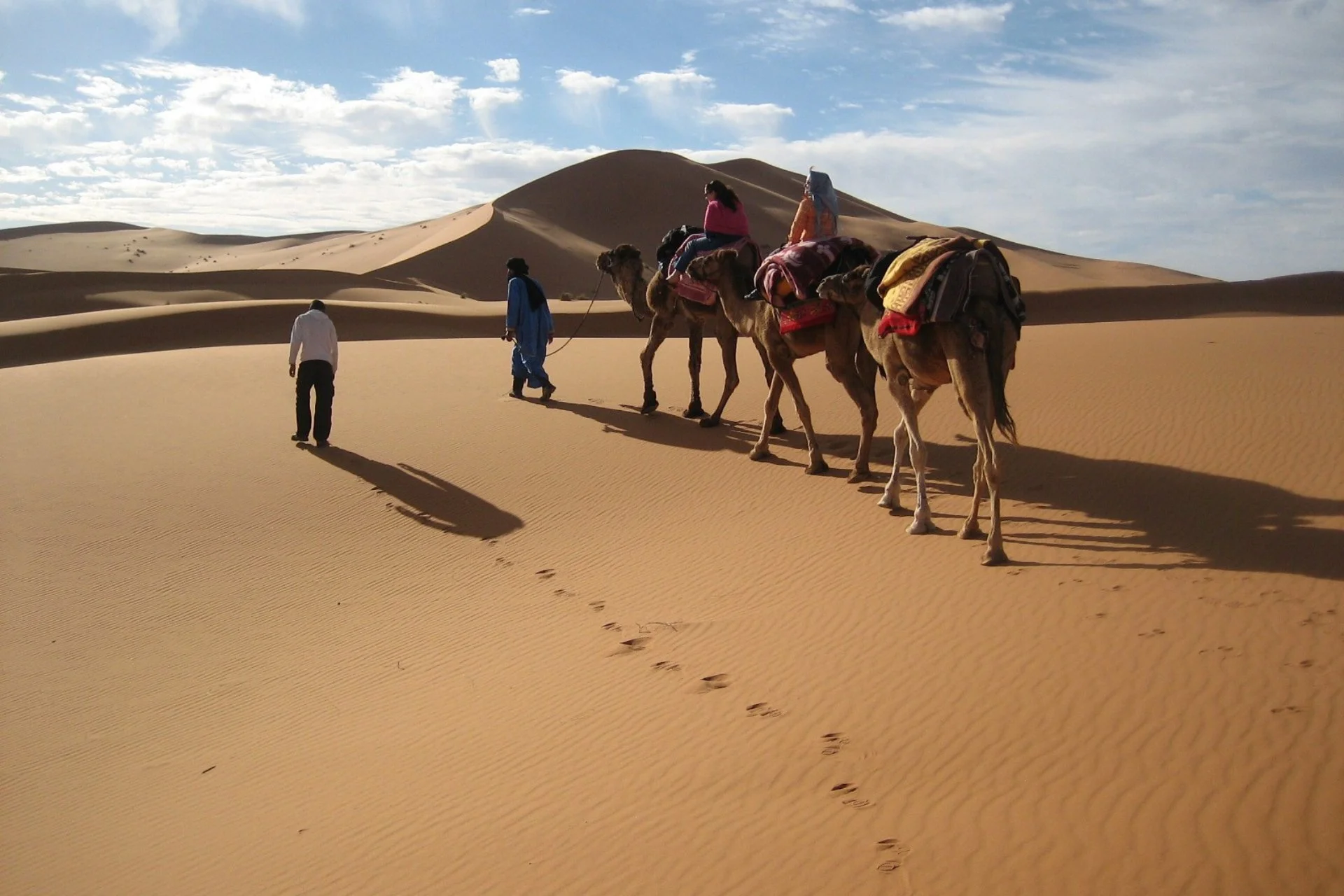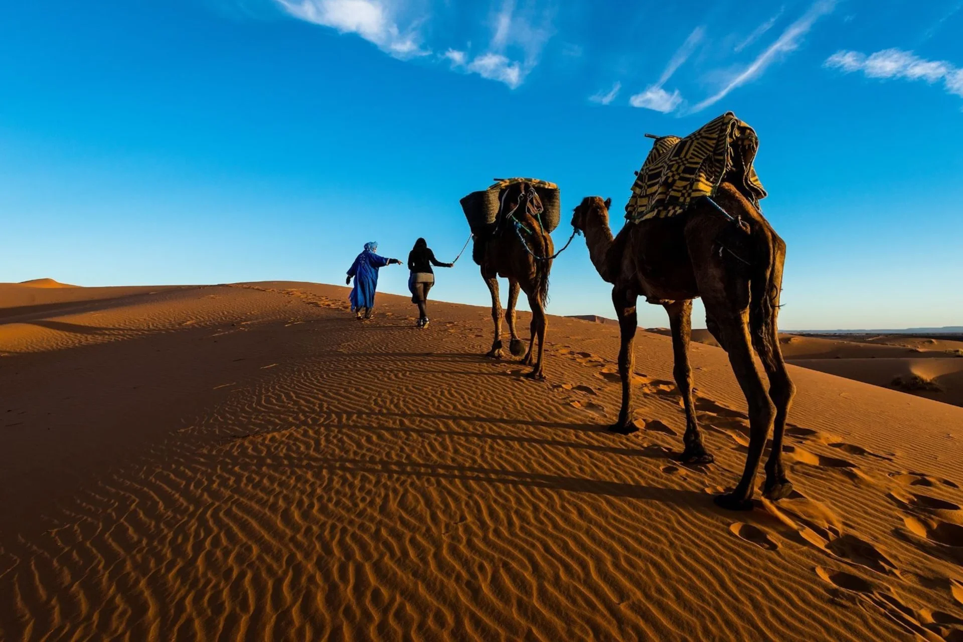 Continuing eastward, landscapes transition into arid plains punctuated by oasis towns. By afternoon, the Sahara’s edge appears as we arrive in Merzouga, home to the legendary Erg Chebbi dunes. Here, a camel caravan awaits to transport us across rippling sands at sunset—a quintessential Saharan experience.