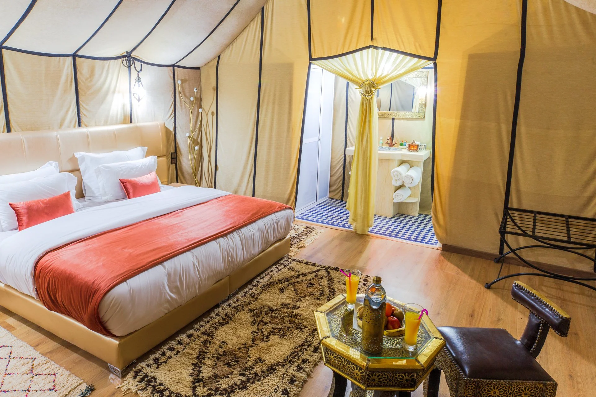 Equipped with a private shower and WC with hot water and electricity, this tent ensures a comfortable and convenient stay in the heart of the Sahara. Blending modern amenities with authentic desert charm, it is the ideal retreat for families seeking both adventure and relaxation among the golden dunes of Merzouga.