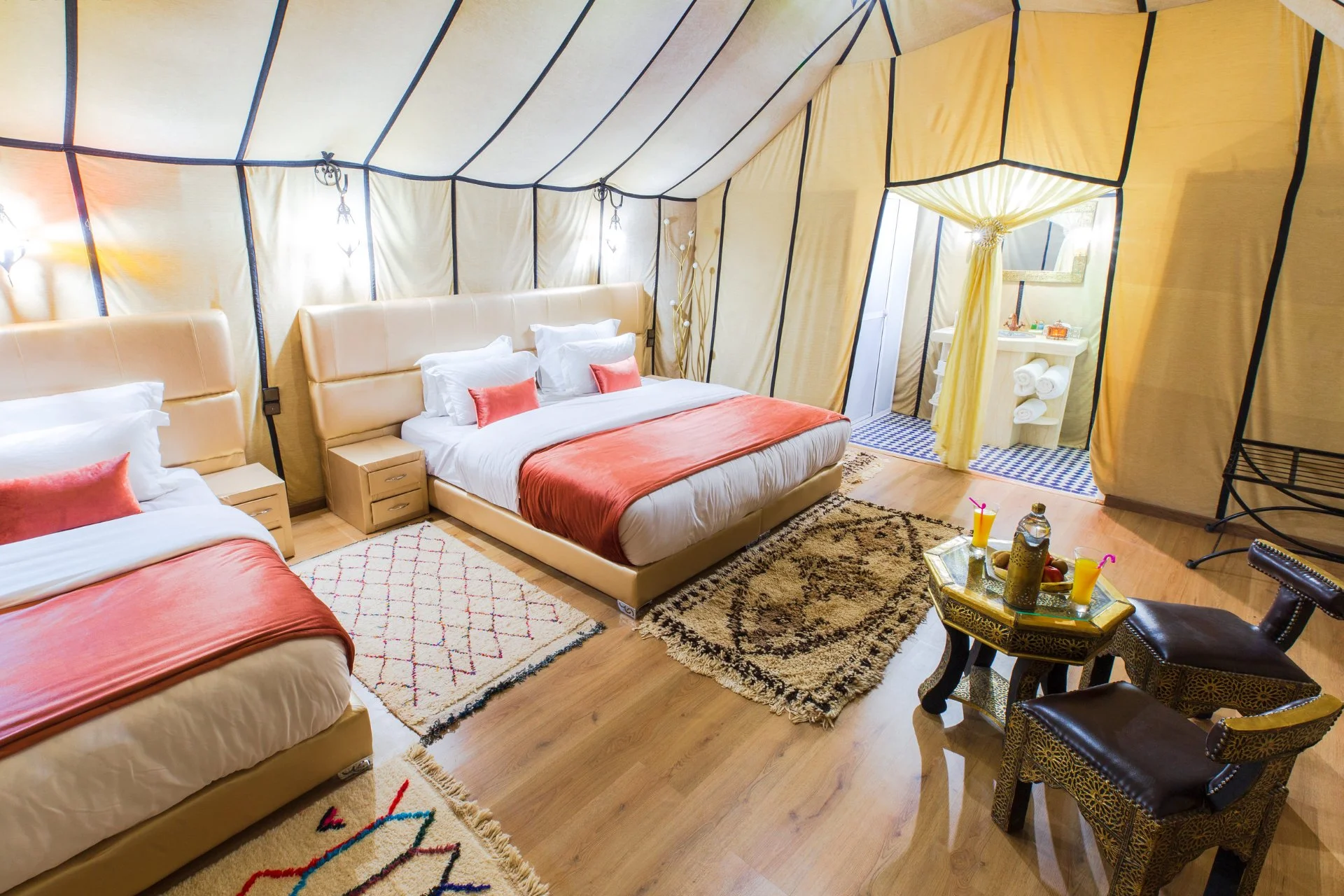 Our Quadruple Luxury Desert Tent is thoughtfully designed to provide comfort and space for families traveling together. The tent features one double bed combined with two separate comfortable beds, creating the perfect sleeping arrangement for up to four guests. A small seating area in front of the tent enhances the cozy atmosphere, offering a peaceful spot to relax and admire the tranquil desert surroundings.