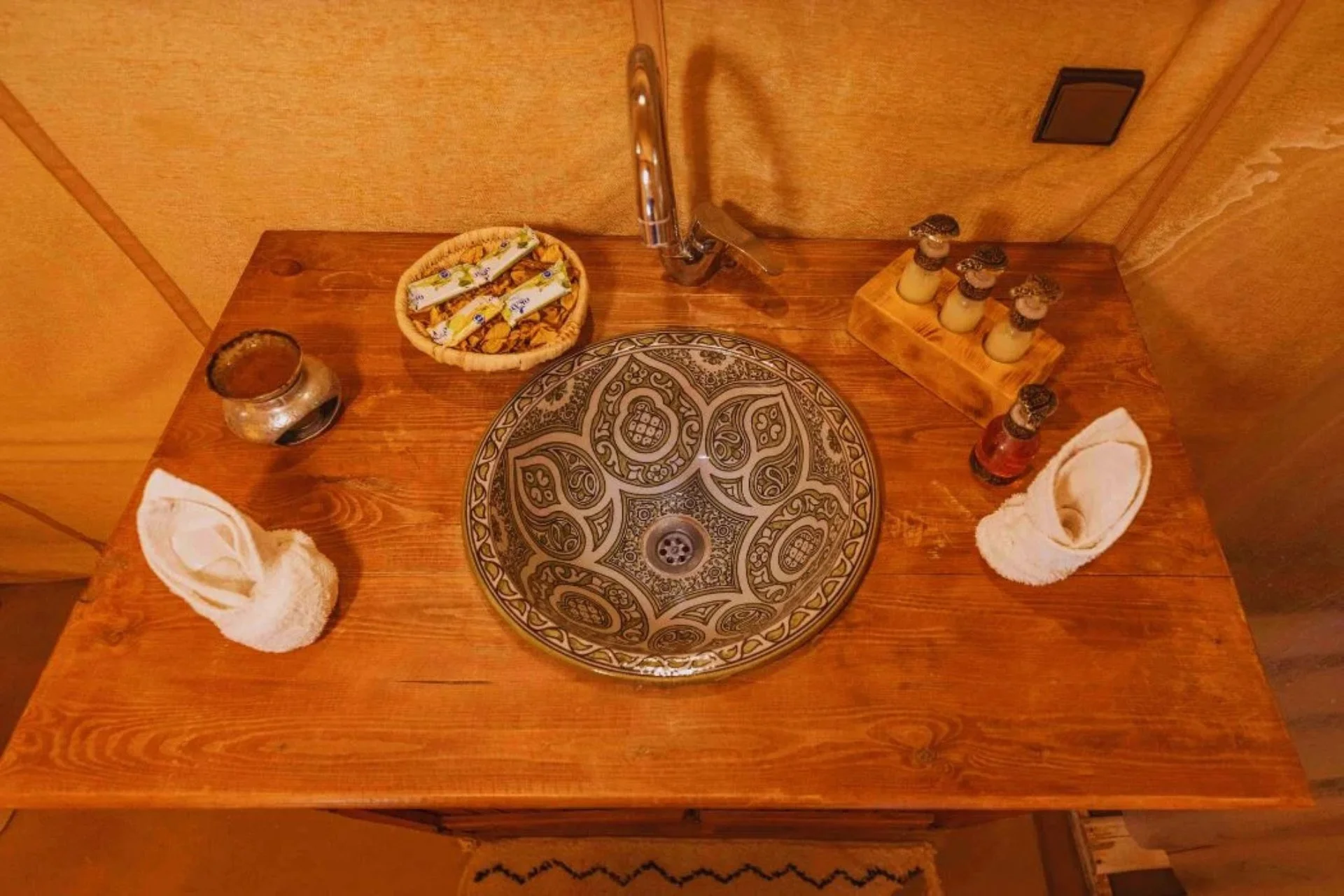 Our Single Luxury Desert Tent is thoughtfully designed for solo travelers seeking comfort, privacy, and tranquility in the heart of the Merzouga desert. The tent features one comfortable single bed along with a small extra bed, making it both practical and cozy. It includes a private shower and WC with hot water, as well as electricity for a convenient and relaxing stay.