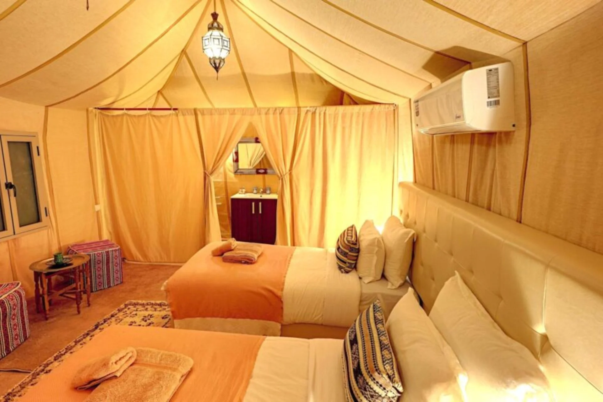 Perfect for siblings, friends, or travel companions, this tent offers both privacy and relaxation in the heart of the Merzouga desert. Combining modern amenities with authentic Moroccan décor, it provides a peaceful atmosphere surrounded by the golden dunes of the Sahara. Wake up to breathtaking desert views and enjoy a truly unforgettable desert experience.