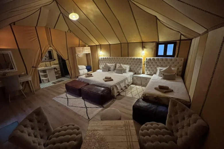Our Quadruple Luxury Desert Tent is thoughtfully designed to provide comfort and space for families traveling together. The tent features one double bed combined with two separate comfortable beds, creating the perfect sleeping arrangement for up to four guests. A small seating area in front of the tent enhances the cozy atmosphere, offering a peaceful spot to relax and admire the tranquil desert surroundings.
